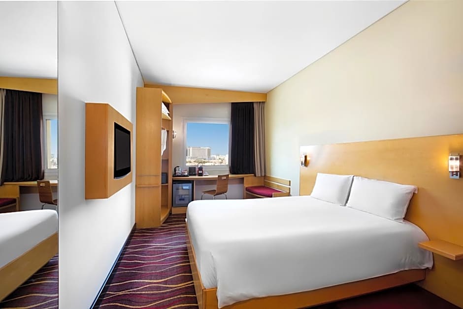 Air-conditioned room featuring a double bed, a flat-screen satellite TV, a fridge, and a safety deposit box.